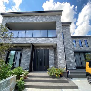 お客様のご要望 シンプルかつお洒落なカリフォルニアスタイルの家 リビングに吹き抜けがほしい ストリップ階段にしたい リスト項目 石目調の外壁にとブラックでシンプルかつ高級感のある外観。室内もダークブラウンを基調とした落ち